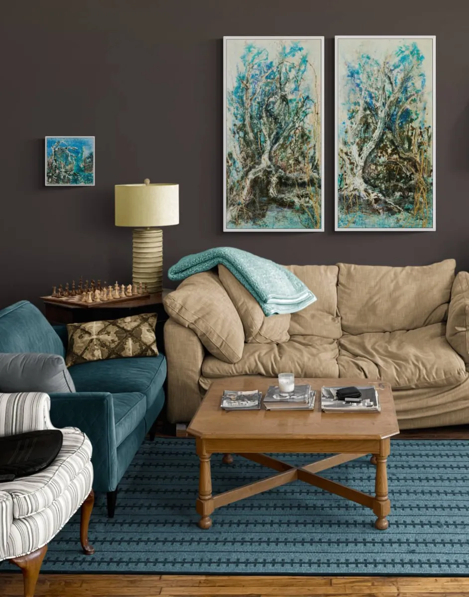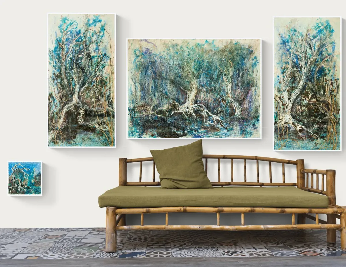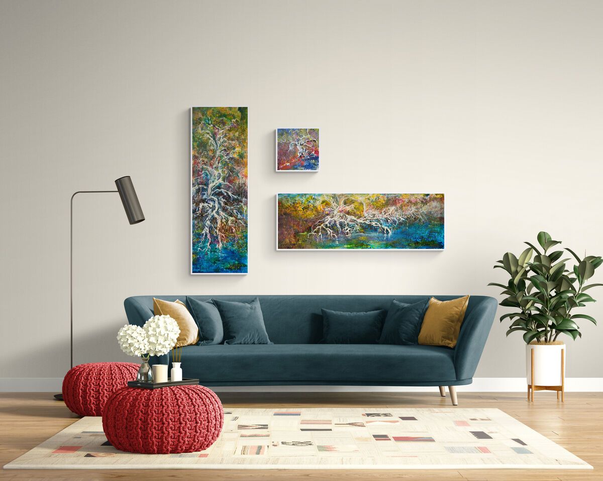 set of 3 framed acrylic-based mixed-media paintings on gallery-wrapped canvas inspired by a favourite spot that we refer to as "Gnarly Reach"