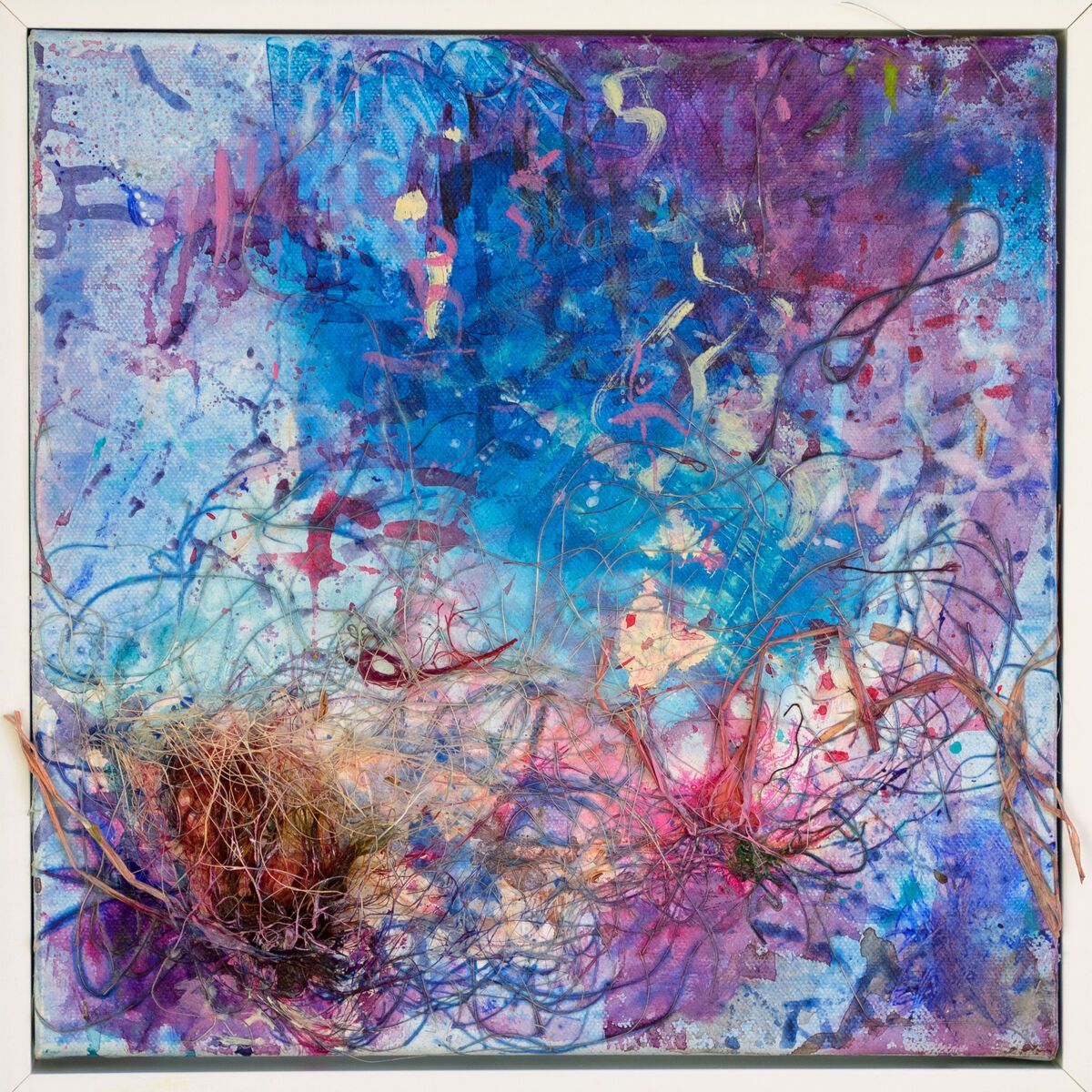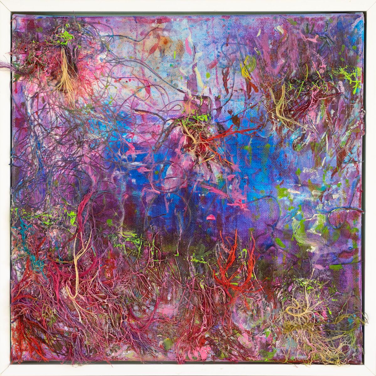 One of set of twelve 30x30 cm acrylic-based mixed-media gallery-wrapped canvases which we have exhibited together and called "The Boardwalk". Seen here framed so slightly bigger. Click on image to see 3 of them in a room setting.