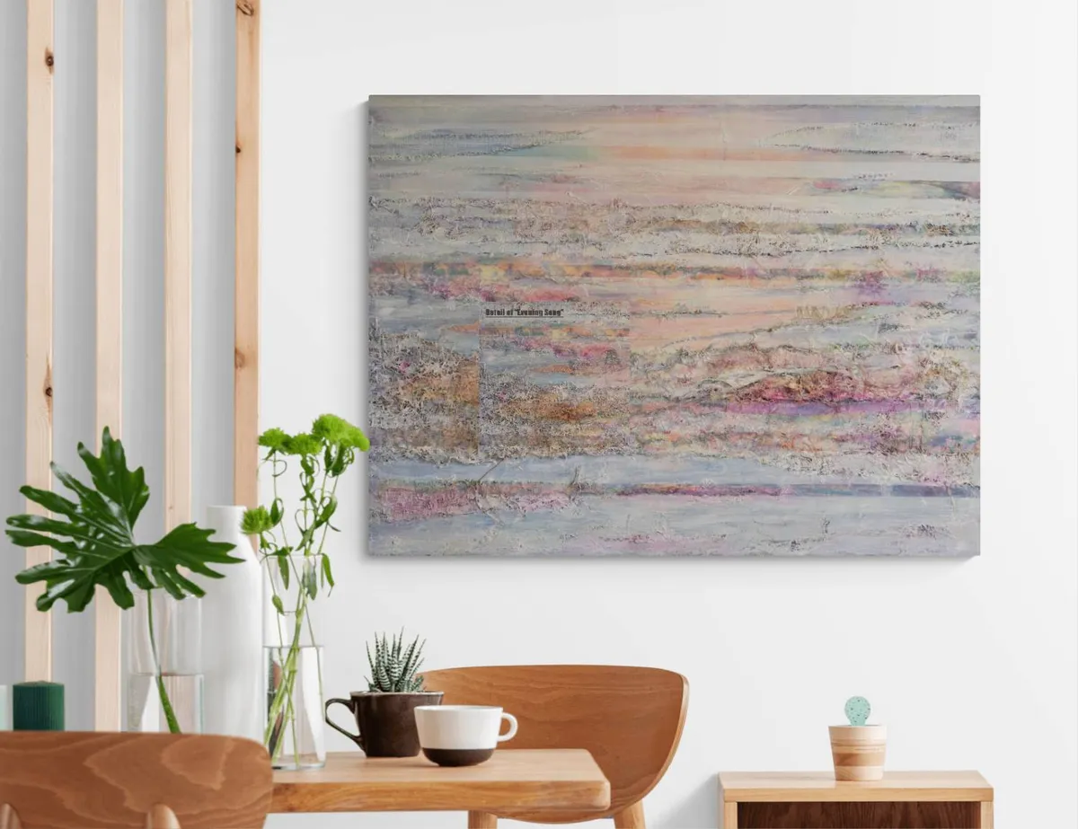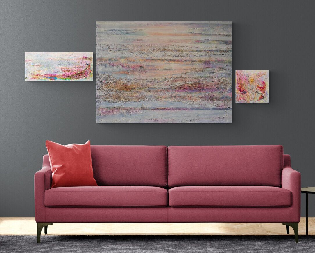 "Evening Song" (122 x 92 cms mixed media painting on gallery-wrapped linen) displayed with two smaller mixed media on canvas paintings, "Samphire Season" (61 x 25.5cms) and "Shadowy Samphire 1" (30cms square - comes with 4 hangers so you can choose which way is up!)