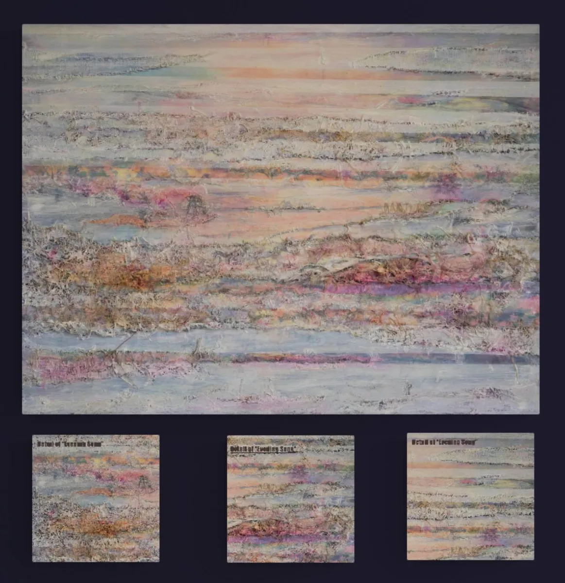 Close-up showing colour and texture detail on "Evening Song" - 122 x 92cm highly textured mixed media painting on gallery-wrapped linen. Click on the image to see the whole painting.