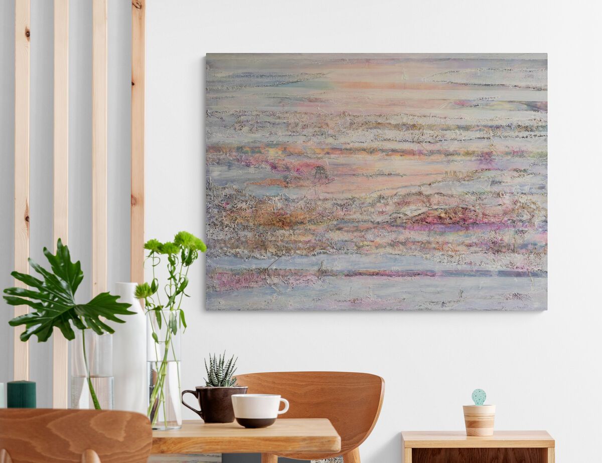 Acrylic-based 122 x 92 cm mixed media painting on gallery-wrapped linen displayed in a room setting