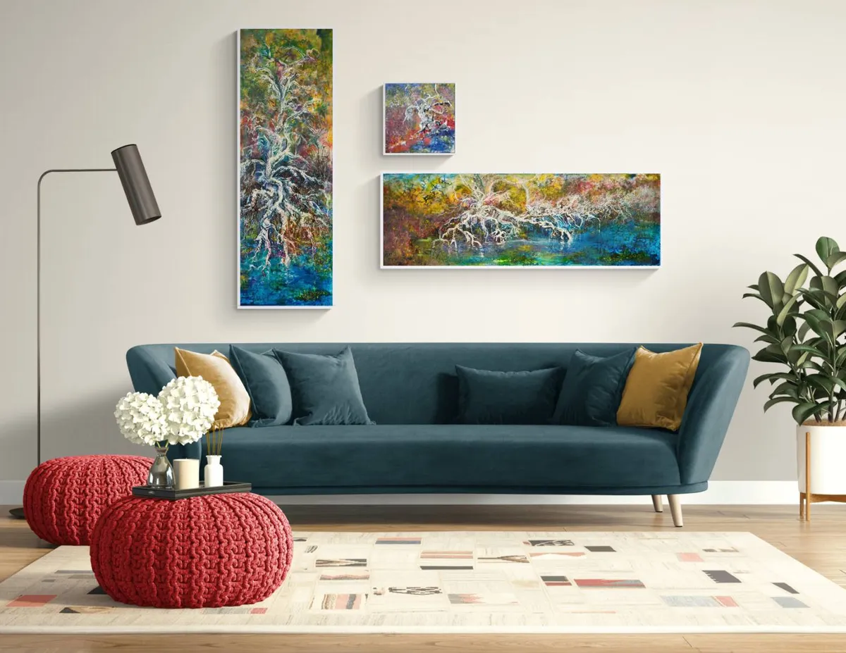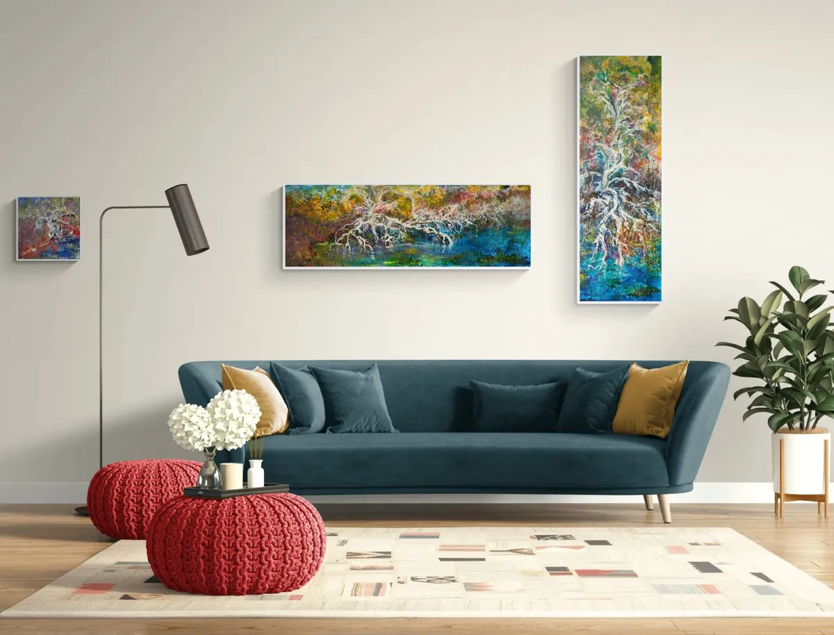 Concept piece for Gnarly Reach set of 3 mixed media paintings ... Gnarly Reach I (120 x 40 cms) Gnarly Reach II (40 x 120 cms) + original concept piece (30 cms square) - all framed in white